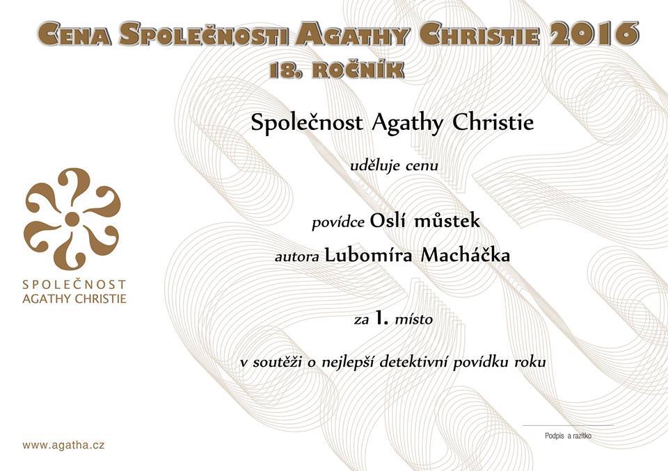 Česká Společnost Agathy Christie vyhlašuje již 19. ročník literární soutěže o nejlepší detektivní povídku roku 2017 Cena Společnosti Agathy Christie. Povídky můžete zasílat do 30. dubna 2017. Prodlužujeme příjem povídek do středy 10. května 2017.